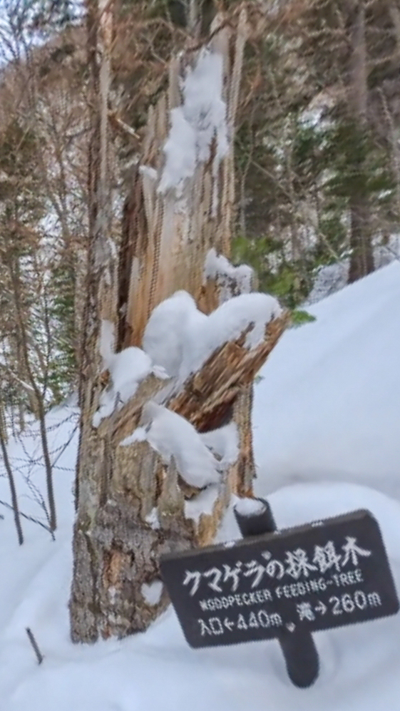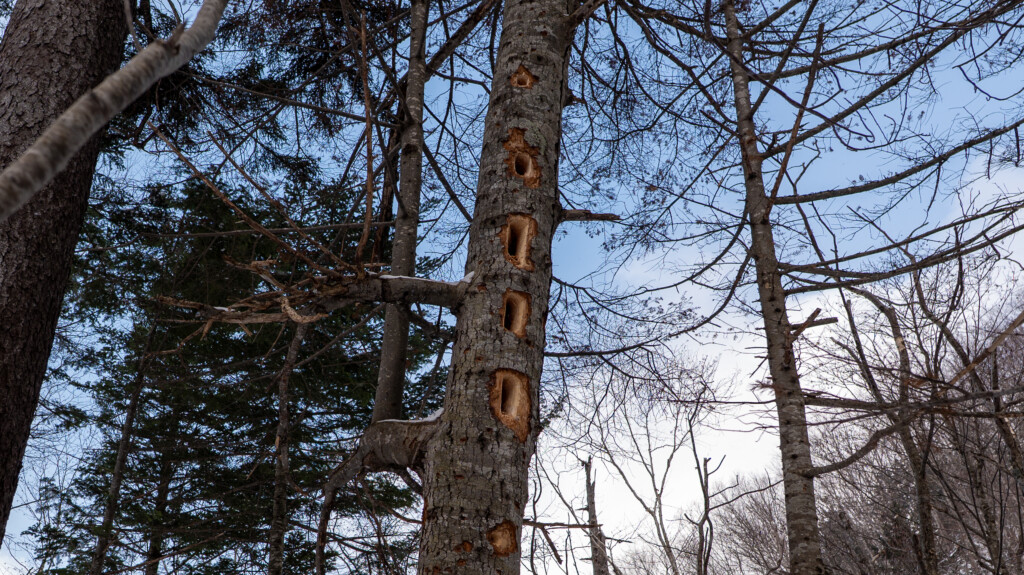 樹皮が大きく剥がれた木は、日本最大級のキツツキであるクマゲラが虫を探した跡で、冬の森に残された、動物たちの分かりやすい痕跡です。
