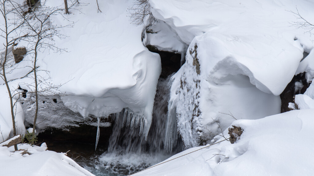 また、気温や湿度、沢の状況が合えば、霜の華・フロストフラワーや飛沫氷柱のような、雪と氷が作る繊細な造形に出会えることもあります。