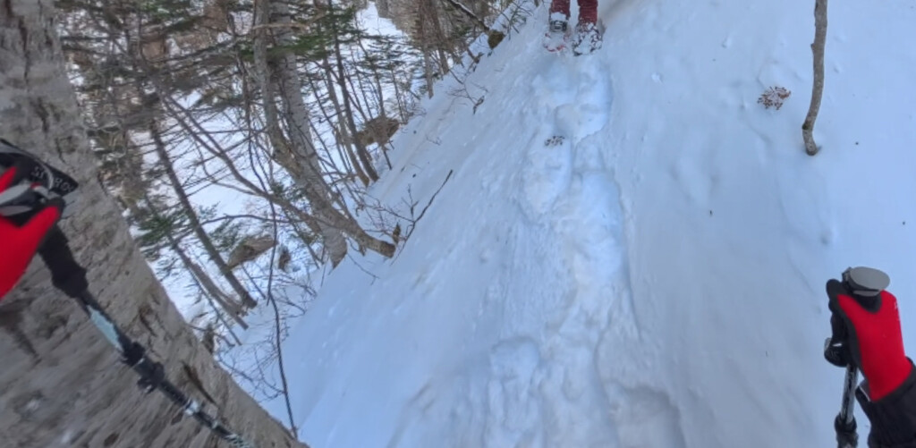A. 冬山初心者の方でも参加相談はできますが、このコースは狭い坂道があり、スノーシューに多少慣れている方に向いている内容です。