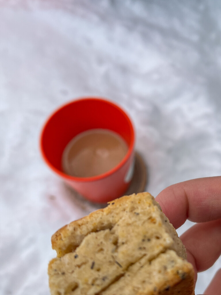 ティータイムなど:雪上で温かい飲み物と休憩