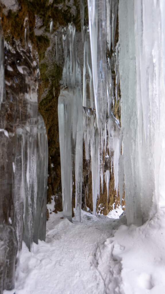 渓谷の奥では、高さ10 m前後の氷瀑や氷柱が岩壁から垂れ下がり、見上げるような距離で観察できます。層雲峡の厳しい寒さと地形が生むスケール感は、写真で見る以上の迫力でした。厚みのある氷は内部で光を吸収・散乱するため、青白く発光するように見える場面もありました。